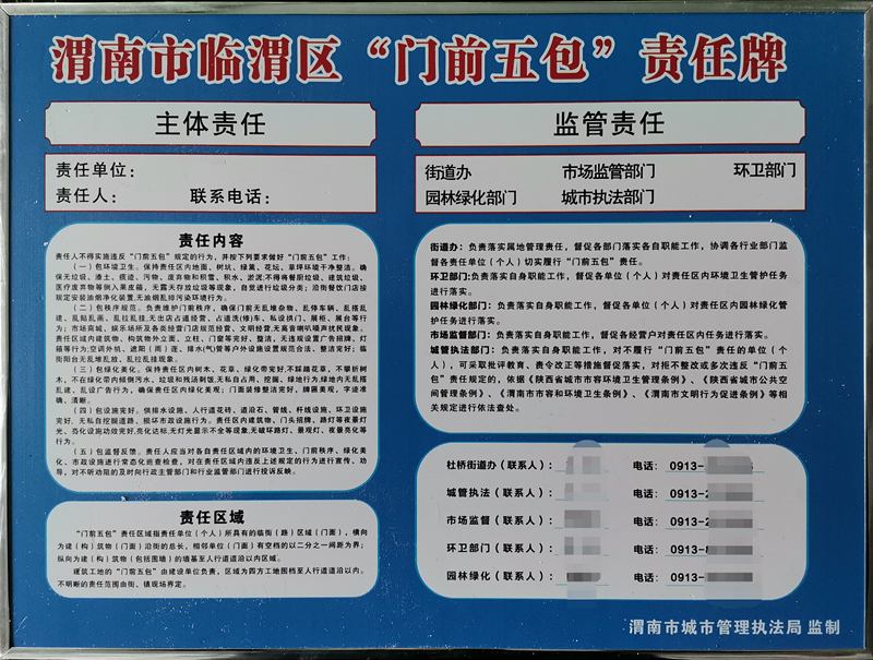 为全面加强中心城区市容环境管理,全民参与凝聚合力促进市容环境品质提升,市、区开展中心城区“门前五包”责任制专项治理工作。由辖区街道办牵头负责,市场监督、园林绿化、环境卫生、城管执法等部门参与,共同与中心城区1.3万余家单位(商户)签订“门前五包”责任书,在签订责任书的同时,给单位(商户)发放《渭南市临渭区“门前五包”责任牌》,“门前五包”责任牌在单位(商户)进门处醒目位置挂设上墙。