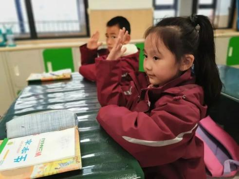 干净明亮的教室,摆放整齐的桌凳,同学们精神饱满,课前准备动作整齐利落。师生互相行礼问好,老师笑容灿烂,学生声音稚嫩而响亮。